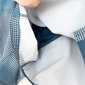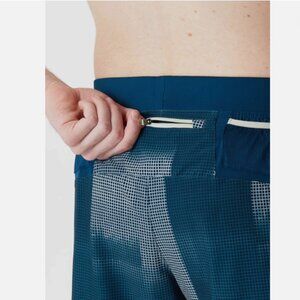 Men's running shorts by Brooks. Style is the Sherpa 5" Running Short. Blue and white design. Lightweight and breathable. Zippered pocket on back and smaller side pockets.