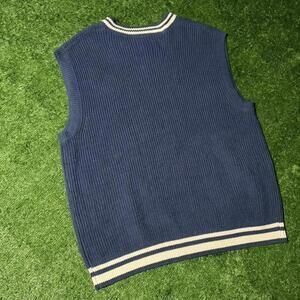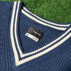 Original Use ribbed knit sweater vest featuring a classic V-neck with contrast white stripe detailing at the neckline and hem. Clean blue colorway with a structured ribbed texture gives this piece a timeless, collegiate feel that layers easily over tees, oxfords, or long sleeves. Tagged size M. The simple construction and stripe accents lean into traditional preppy styling with a modern retail edge. Estimated era: modern / late 2010s–2020s, inspired by vintage ivy and schoolwear aesthetics rather than true vintage production. Easy to style casually or dressed up, making it a versatile layering essential.