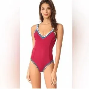 Elegant burgundy one-piece by KIINI. Features intricate blue and yellow trim. Perfect for beach or poolside.