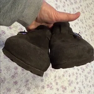 Birkenstock Dark Brown Suede Boston Clogs with Copper Buckles