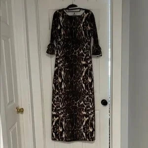 Floor-length leopard print maxi. Three-quarter sleeves with ruffle cuffs. Fitted waist and flowing skirt. Soft, drapey fabric with bold animal pattern. Perfect for evening or special occasions.