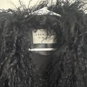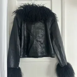 Sophisticated black faux leather jacket with a voluminous curly faux fur collar and matching fur cuffs. Cropped silhouette with button-front closure for easy styling. Lightweight lined interior for comfortable wear. A polished statement piece that elevates any outfit.