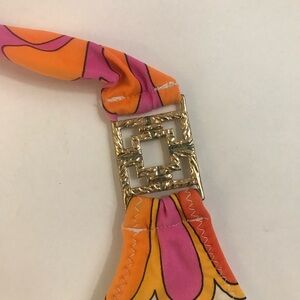 Gorgeous colorful bikini top has gold jewelry details on the straps. It does not have foam cup inserts but you can easily add them at the slip in cup pockets.