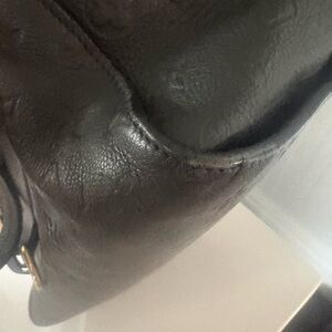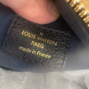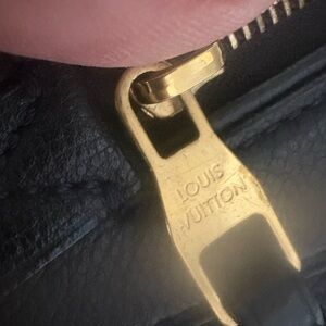 Soft grained, Mahina leather and boss Louis Vuitton, Paris stamp gold hardware front zip pocket with leather tab, decorative D ring on the front top zipper closure and double handles in excellent condition with COA and dust bag