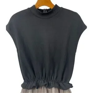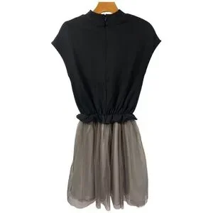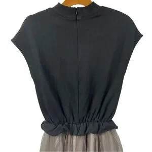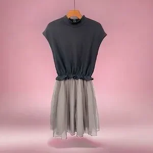 Chic women's dress featuring a black knit mock-neck top and a soft gray chiffon skirt. Elastic waist creates a flattering silhouette. Lightweight and versatile for day-to-night wear.