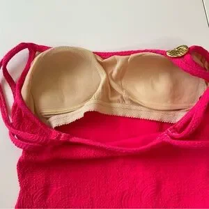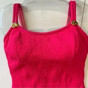 Flattering and cute vintage fuchsia one piece swimsuit with cute double straps and gold tone nautical shell accents with seaming, a textured fabric and soft cup bra for a flattering fit. Made in USA. Also makes a cute bodysuit