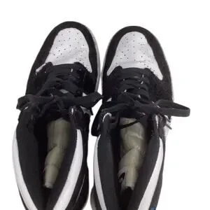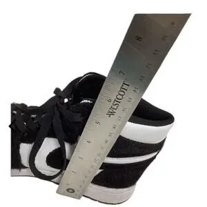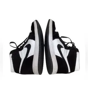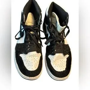 Experience the perfect blend of style and comfort with these Nike sneakers. Featuring a striking black and white color scheme, these high-top shoes boast a classic basketball silhouette. The glittery white accents add a touch of flair, making them a standout choice for any casual occasion.