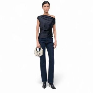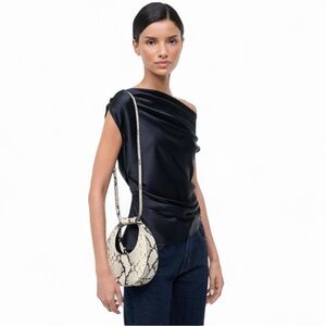The Goodnight Moon top handle bag from Staud is crafted of snake embossed leather and features a structured moon shape. The perfect size for an evening bag, it also features a delicate leather detachable shoulder strap allowing you to dress this up or down. Features: top handle, magnetic snap closure, 100% cow leather, structured silhouette with flat base for stability. Brand new