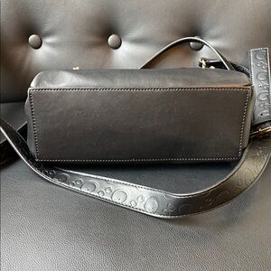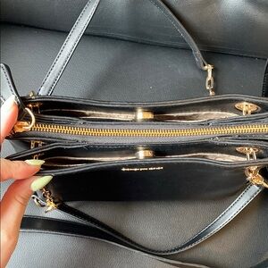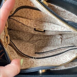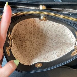 Stylish black GUESS crossbody with gold-tone chain accents. Smooth faux leather finish with an adjustable strap for versatile wear. Elegant gold hardware and embossed detailing add a polished look. Practical and chic for everyday use.