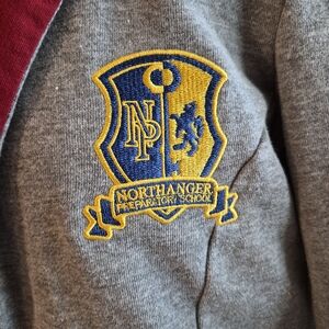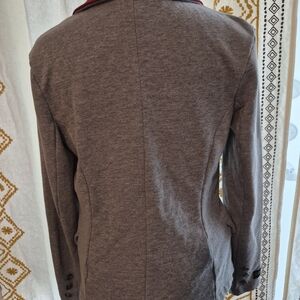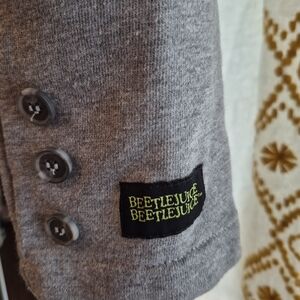 Beetlejuice gray blazer featuring red trim and an embroidered patch with functional pockets. Perfect for a smart casual look.