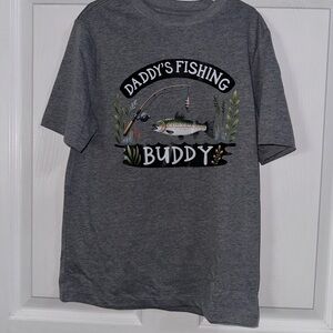 Celebrate your love for fishing with the 'Daddy's Fishing Buddy' T-Shirt. This NEW handcrafted tee is perfect for any fishing enthusiast. A gray Wonder Nation shirt was used. It is a size M (8) kids and made out of 60% cotton 40% recycled polyester.