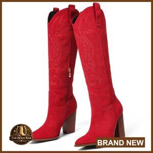 Knee High Cowboy Boots Pointed Toe Chunky Heels Pull-on Embroidered Western