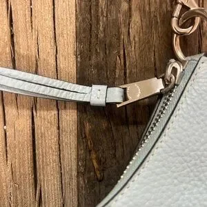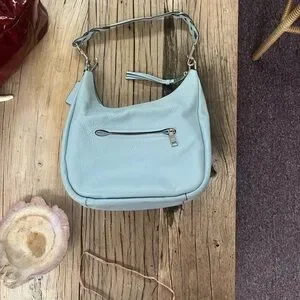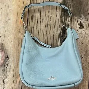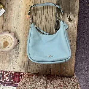 Coach pebbled leather shoulder hobo in a soft light blue. Excellent condition ! Single comfortable strap for shoulder wear. Top zip closure and leather zipper pull. Subtle silver-toned Coach logo on front. Clean, versatile everyday style.