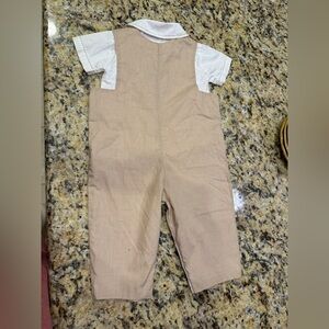 Smocked embroidered fall scarecrow gingham romper. Shirt is included in this set. Please note small spot on back that may come out with stain treatment. Comfortable and stylish for your little one.