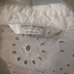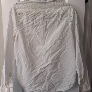 Crisp white button-up blouse with eyelet detailing across the shoulders and upper back. Lightweight and breathable. Classic collar and long sleeves. Easy to pair with jeans or skirts.