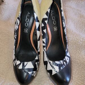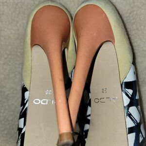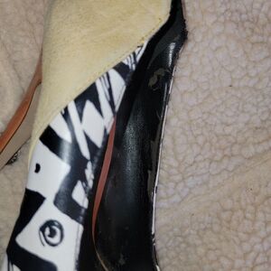 suede leather at top shoes some color transfer from clothes, can possibly be cleaned. right shoe has has some peeling on inner lining (see photos), left shoe is fine. this isn't visible when worn. very stylish, definitely make a statement!
