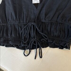 Lush black baby doll peplum smocked tie- front the shells 100% cotton lining is 100% Rayon V-neck sleeveless gathered at Waist really cute summer top size extra large