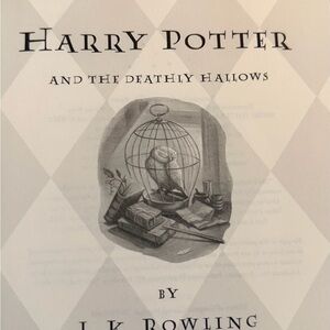 Harry Potter and the Deathly Hallows with classic monochrome illustration. Features owl in a cage and wizarding props. Simple, elegant cover art. Great for collectors and fans.