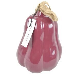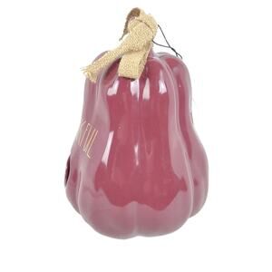 This charming ceramic birdhouse by Rae Dunn features a gourd shape in a burgundy purple shade with "Thankful" in gold lettering. There is a burlap ribbon on the top. The underside has vent holes and a removable plug. Measures 8-1/2" tall, 6" wide.
