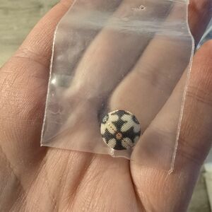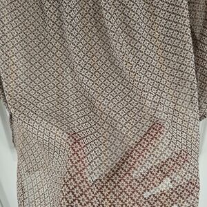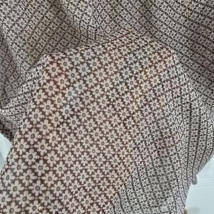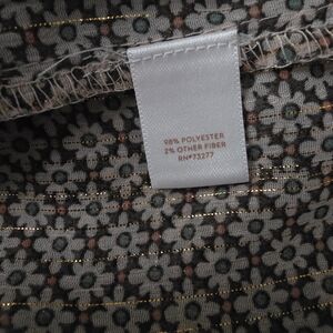 Floral pattern. 3/4 sleeves. Round neck. Material has some gold glitter( see photos and video). Unlined. 98% polyester, 2% other fibers. All details see in photos, please. Extra button.
