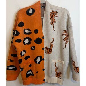 Women TIGER Animal Print Sweater Cardigan Button Long Sleeve Orange Black XL