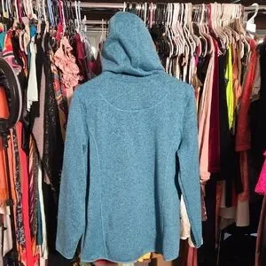 Soft heathered teal knit fleece. Full front zip with hood. Zippered hand pockets. Subtle logo patch at chest.