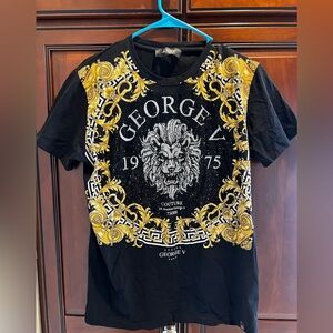 Stylish George V t-shirt with bold lion graphic. Features intricate gold detailing on a black background. See video for bling visual