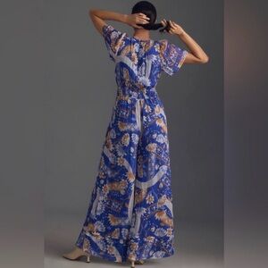 This is the Anthropologie Somerset Jumpsuit Chiffon Edition. It’s a gorgeous, flowy blue, white and orange jumpsuit with a floral pattern. V-neck with short flutter sleeves. Defined waist creates a feminine shape. Lightweight fabric drapes elegantly. Worn only once!