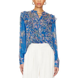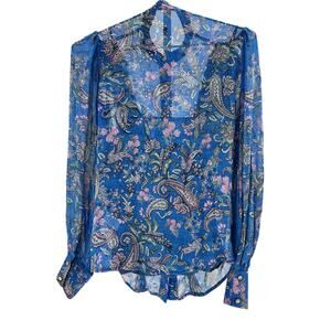 Sheer paisley floral button-front blouse with ruffled trim and long sleeves, crafted from lightweight 100% viscose in cobalt blue. Includes a coordinating camisole lining.
