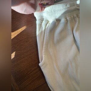 Waffle-knit lounge pants in cream. Elastic waistband for comfort. Subtle YoungLA script tag detail. Relaxed, easywear style for everyday lounging.
