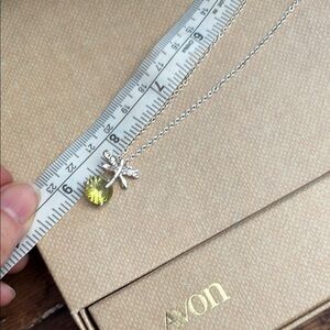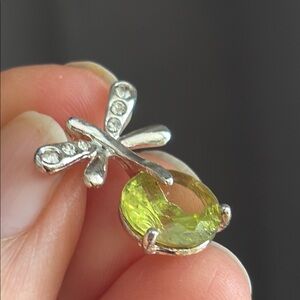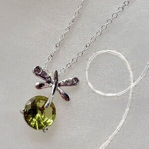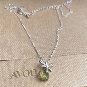 Beautiful Avon dragonfly pendant necklace featuring a sparkling green peridot-like crystal stone with rhinestone accents on the wings. Silver tone finish with an 18" chain.