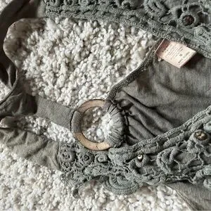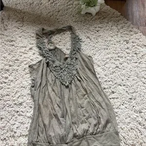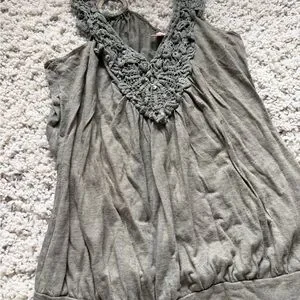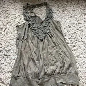Elegant Gray green bohemian Sleeveless Blouse with Lace Accents. elegance with this sleeveless blouse, featuring exquisite lace accents. The soft gray hue adds a touch of sophistication to your wardrobe. Size medium