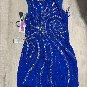 Dazzle in this royal blue mini dress. Features intricate sequin patterns. Sleeveless design for elegance.