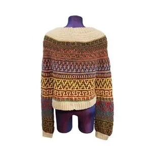 Handmade crochet sweater features a vibrant multi-color geometric pattern with a bohemian aesthetic. This chunky knit pullover is designed with a wide scoop neckline and ribbed trim at the collar, cuffs, and hem. The intricate mosaic-style stitch work incorporates shades of orange, blue, yellow, and red against a neutral cream base, creating a textured and eye-catching look. Its slightly cropped silhouette and relaxed sleeves make it a perfect statement piece for eclectic or artsy wardrobes.