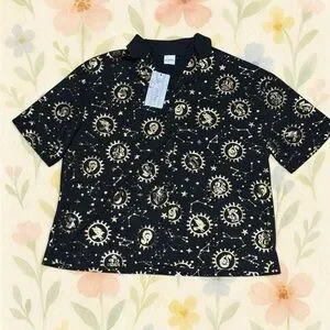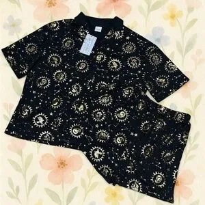harry potter, hogwarts house crest, gryffindor, slytherin, ravenclaw, hufflepuff, wizarding world, hp pajamas, celestial, constellation print, gold foil print, magical lounge set, pajama shorts, button front top, loungewear set, fandom sleepwear, comfy pajamas, hp merch, hogwarts apparel, wizard aesthetic, witchy style, celestial pajamas, star print, collector gift, unisex sleep set