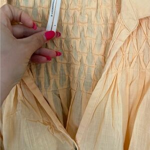 Lightweight button-front blouse with intricate lace panels. Smocked yoke and scalloped lace hem. Relaxed, airy silhouette for layering. Feminine, textured detailing throughout.