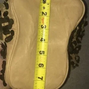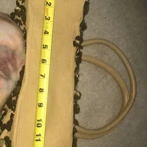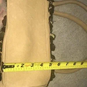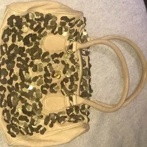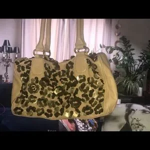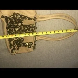 Beautiful leather bag in good used condition. Slight mark pictured near handle appears to be on surface but I won’t try to take it off since it’s slight. Watermark on handle. Versatile, neutral yet stunning glimmer from the brass metal sequin flowers. Measurements in pictures, thanks to my awesome hubs