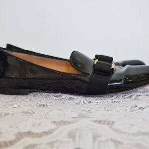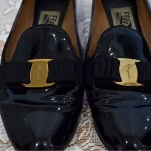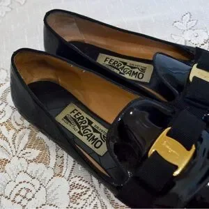 Salvatore Ferragamo Black Patent Leather Vara Bow Loafers with Gold Plaque