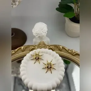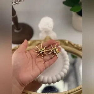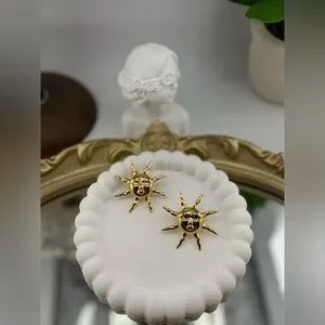 Shine bright with these bold gold sun earrings, featuring a radiant sunburst design with a sculpted face at the center. These earrings bring a mix of celestial energy and artistic style, making them the perfect statement accessory for any outfit.