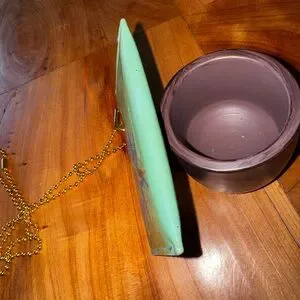 this is a great vintage piece. It has been repurposed by me and unbranded hardware has been added so you can wear it on your wrist or your neck attached to your bag comes with an unbranded chain. This is a one of a kind design that has been hand painted by me with Angela, leather paint and finisher exterior. Good condition may have some light scratches. Interior has been touched up with Angela leather paint as well does have some creasing as you can see in picture snap works great see pictures closely. They are part of the description. Thank you.