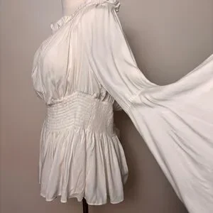 Gorgeous bohemian style white peasant blouse featuring a flattering smocked waist that creates a soft, feminine silhouette. Designed with a romantic ruffled neckline and dramatic wide bell sleeves for that effortless free-spirit look.