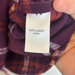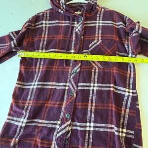 Maurices Purple Plaid Hooded Flannel Shirt, Size Medium — Soft 100% cotton construction. This cozy hooded flannel features a button-front closure, a drawstring hood, and a functional chest pocket. The purple, orange, and white plaid pattern makes it a perfect layering piece for cool weather. Excellent pre-owned condition. Breathable and comfortable material. Great for casual everyday wear or outdoor activities.