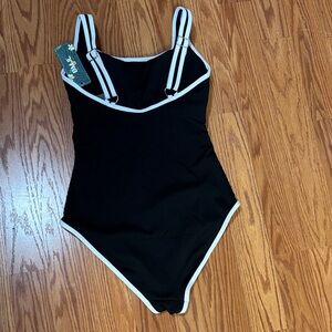 Sleek ribbed one-piece swimsuit. Scoop neckline with contrasting white trim. Figure-flattering, minimalist design. Versatile and chic for beach or pool.