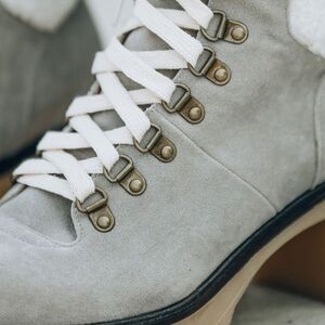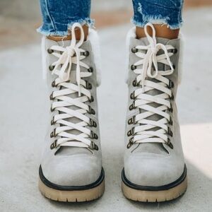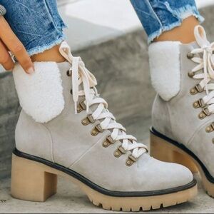 Grab our Conquest Heeled Shearling Lace Up Boot before it sells out! This cute hiker boot comes in a light grey faux suede fabric with cream faux shearling ankles and lace up closures! Finished with a 2.5” chunky heel and treaded rubber soles.