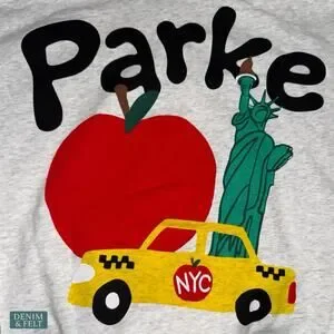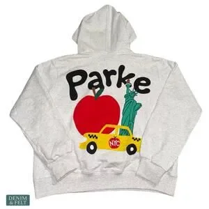 Rare Parke hoodie from the NYC pop-up with the iconic apple, taxi, and Statue of Liberty back graphic. A standout streetwear piece with playful city energy and hard-to-find appeal.