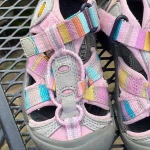 Keen kids sandals in pink with multicolor Pastel striped webbing. Closed-toe design for protection. Cushioned footbed for comfort. Easy bungee lace and adjustable heel strap.Very good minor wear condition size 8 US