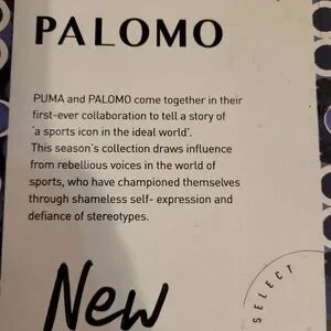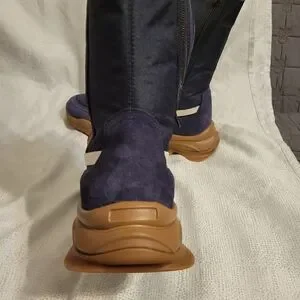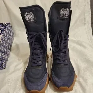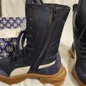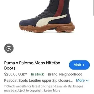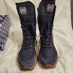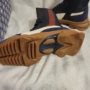 Stylish navy high-top sneakers with red and white accents. Features a chunky brown sole. Puma Palomo, men's, size US 9, new with box.