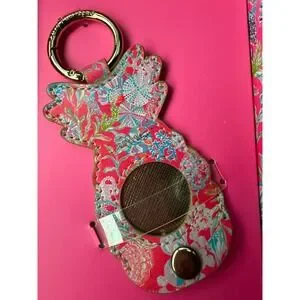 Lilly Pulitzer GPS tag holder in the vibrant "Shell Me Something Good" print offers a stylish way to secure an Apple AirTag. This pineapple-shaped accessory is crafted from durable textured material with gold-tone hardware, including a secure snap closure and a sturdy keyring. Perfect for adding a pop of signature Lilly color to keys, bags, or luggage while keeping track of essentials.
