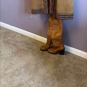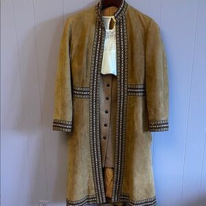 Boho bundle !!!long suede coat in warm tan. Decorative embroidered trim along front, cuffs, waist, and hem. Open-front design with straight silhouette. Soft suede lends a luxe texture. Boots are vintage leather from Brazil size six . Jacket is 1070 Suede, wool skirt is a 4 from Talbots . White shirt is a medium form old navy.
