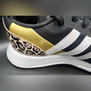 Adidas sneakers featuring a sleek black design. Accented with yellow details and classic white stripes.